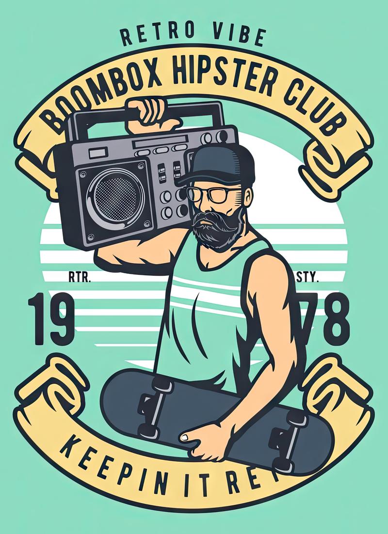 A boombox-toting hipster drops beats with old-school swagger and cool style.