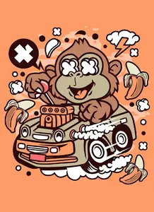 A monkey drives a hotrod — wild speed and cartoon mischief combined.