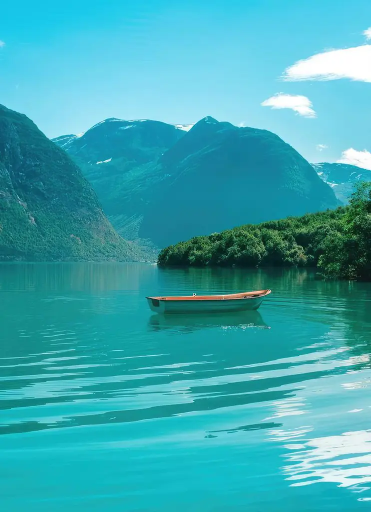 Norway’s pristine lake mirrors snow-capped peaks in crystal-clear, breathtaking stillness.