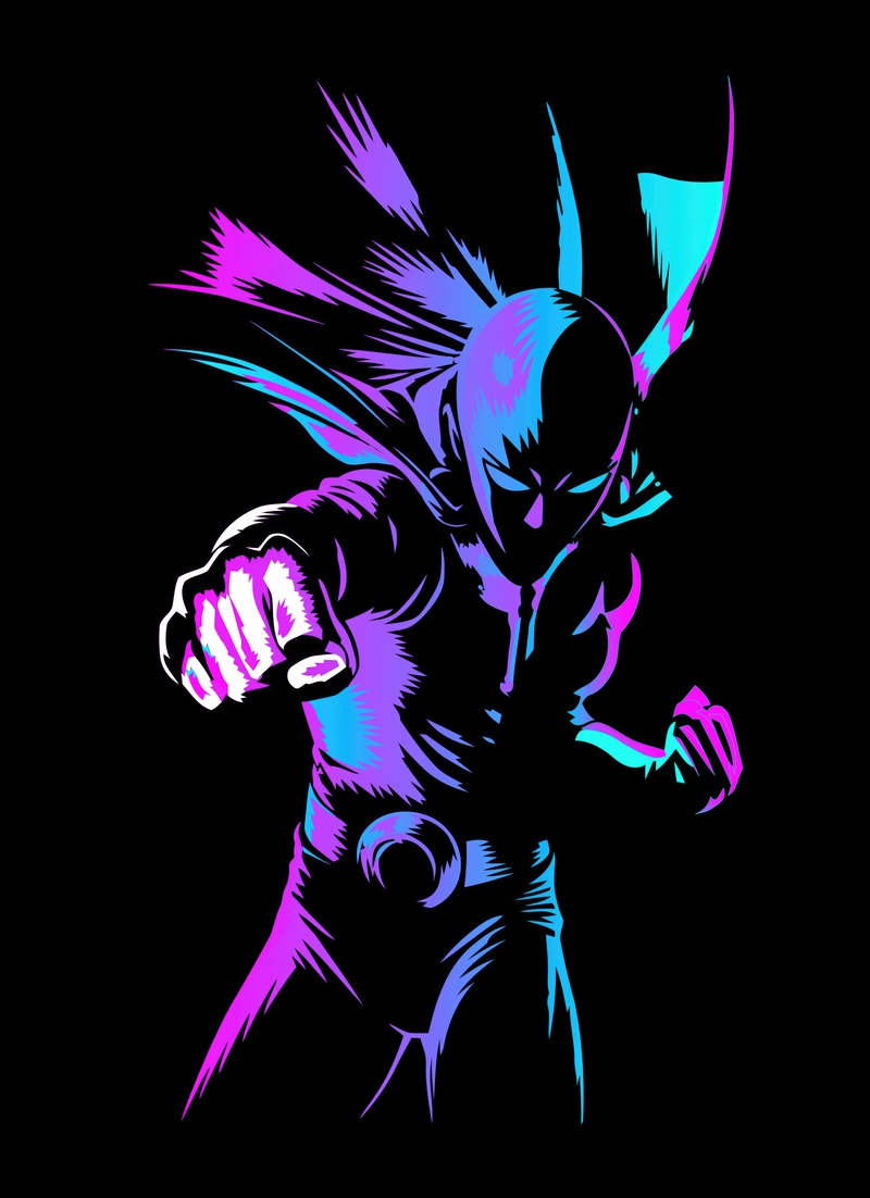 Neon lights outline Saitama’s iconic silhouette in electrifying, bold visual style.