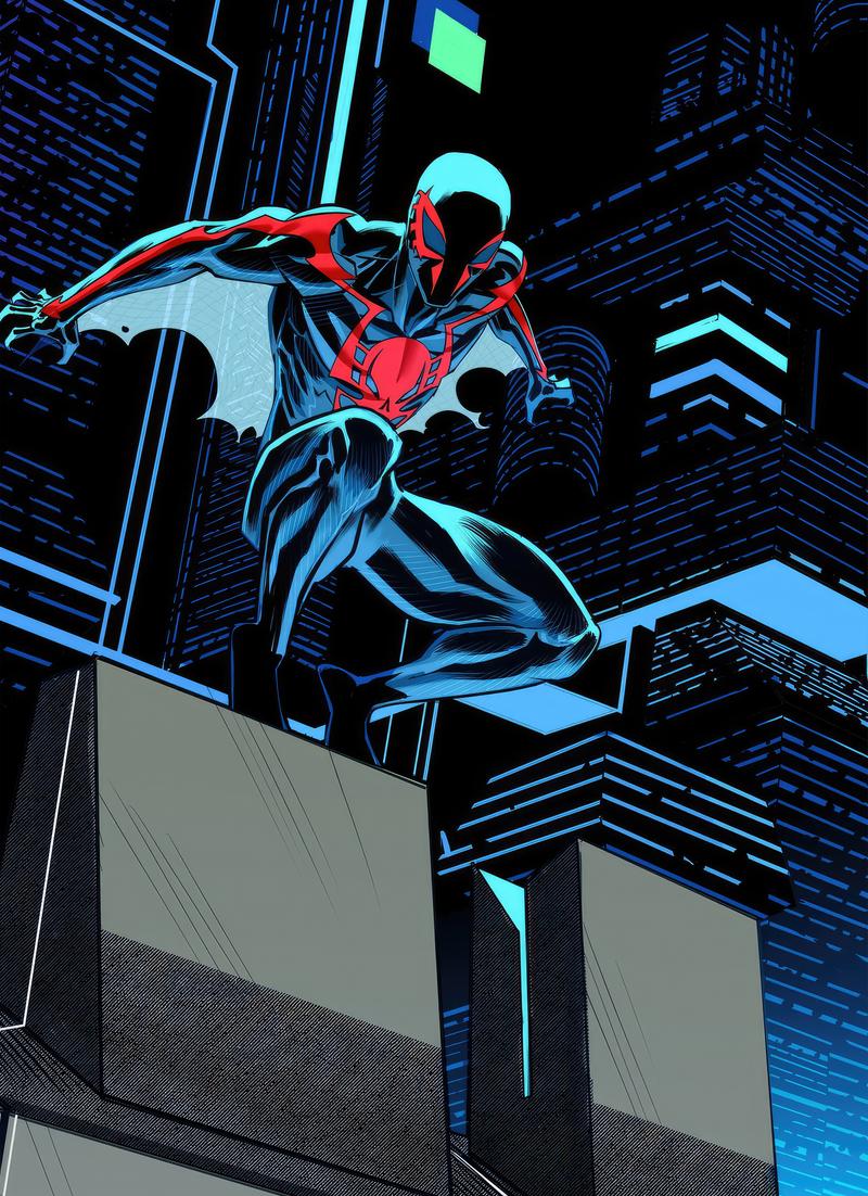 Spider-Man 2099 swings through a futuristic New York with cutting-edge web tech.